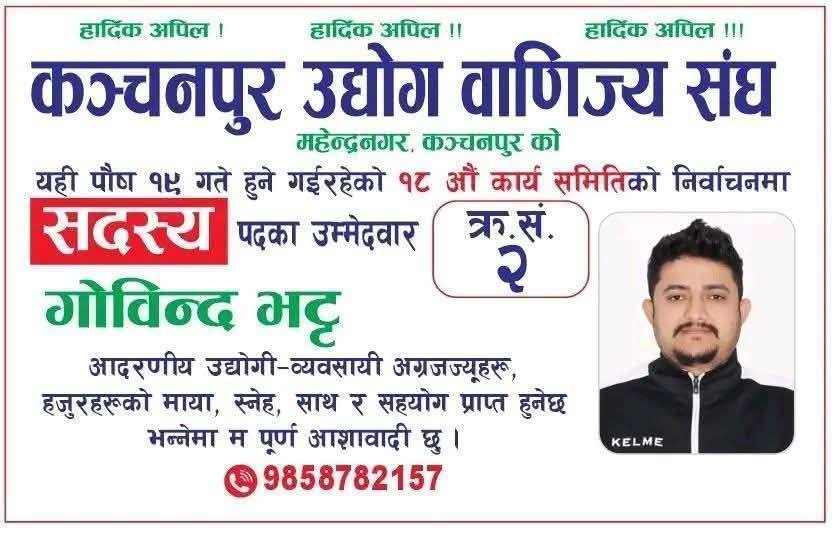दोधारा चाँदनी- पुस १९ नजिकिँदै गर्दा कञ्चनपुर उद्योग वाणिज्य संघको निर्वाचन केवल औपचारिक प्रक्रिया मात्रै रहेन, यो व्यवसायिक नेतृत्वको पुस्तान्तरणको संकेतसमेत बन्दै गएको छ। यही सन्दर्भमा दोधारा चाँदनीबाट एकल प्रतिनिधित्व गर्दै युवा व्यवसायी गोविन्द भट्ट सदस्य पदका लागि चुनावी मैदानमा उभिएका छन्।