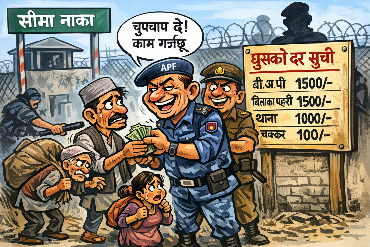 दोधारा चाँदनी- स्वदेशमै केही गर्ने सपना बोकेर फर्केका नागरिक आज आफ्नै सिमानामा घुसको संरचनाले निसास्सिएका छन्। दोधारा चाँदनी खबरमा आएको एक सिमानावासीको बयानले यो पीडा स्पष्ट पार्छ। उनका अनुसार, भारतबाट सामान ल्याउँदा ‘काम अनुसार’ घुस तोकिन्छ।