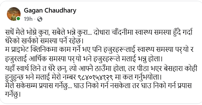 डा. चौधरीले सामाजिक सञ्जालमार्फत लेखेका थिए “सधैं मैले भोग्ने कुरा, सबैले भन्ने कुरा दोधारा चाँदनीमा स्वास्थ्य समस्या हुँदै गर्दा धेरैको खर्चको समस्या पर्ने रहेछ। म प्राइभेट क्लिनिकमा काम गर्ने भए पनि हजुरहरूलाई स्वास्थ्य समस्या पर्यो र हजुरलाई आर्थिक समस्या पर्यो भने हजुरहरूले मलाई भन्नु होला। यहाँ स्वार्थ लिने त धेरै छन्, त्यो आफ्नै ठाउँमा होला, तर पीडा भएर बेसहारा कोही हुनुहुन्छ भने मलाई मेरो नम्बर ९८४०१५४१२९ मा कलगर्नुभयोला। मैले सकेसम्म प्रयास गर्नेछु। घाउ निको गर्न नसकेला तर घाउ निको गर्न प्रयास गर्नेछु।”
