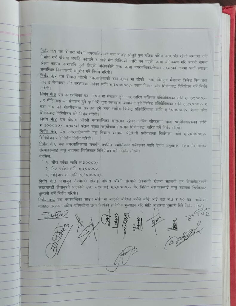 दोधारा चाँदनी नगरपालिकाको कार्यपालिकाले पनि झोलुंगे पुल नजिक पश्चिम–उत्तर क्षेत्रमा पार्क निर्माण प्रक्रिया अघि बढाउने निर्णय गरेको छ। साथै, सो क्षेत्रमा पर्ने नर्सरी वनको जग्गा अतिक्रमण गरी व्यक्तिगत नाममा दर्ता गरिएको देखिएकाले उक्त जग्गा नगरपालिका वा नेपाल सरकारको नाममा फिर्ता ल्याउन सम्बन्धित निकायलाई अनुरोध गर्ने निर्णय समेत भइसकेको छ।