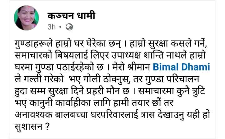 कञ्चन धामी, जो बिमल धामी की श्रीमती हुन्, उनले सामाजिक सञ्जालमार्फत आफ्नो घरमा मानिस पठाएर परिवारलाई त्रास सिर्जना गरिएको दाबी गरेकी छन्। उनका अनुसार हालैको समाचार प्रकाशनप्रति असन्तुष्टि जनाउँदै उपाध्यक्ष नाथको संलग्नतामा यस्तो गतिविधि भएको आरोप लगाइएको हो।
