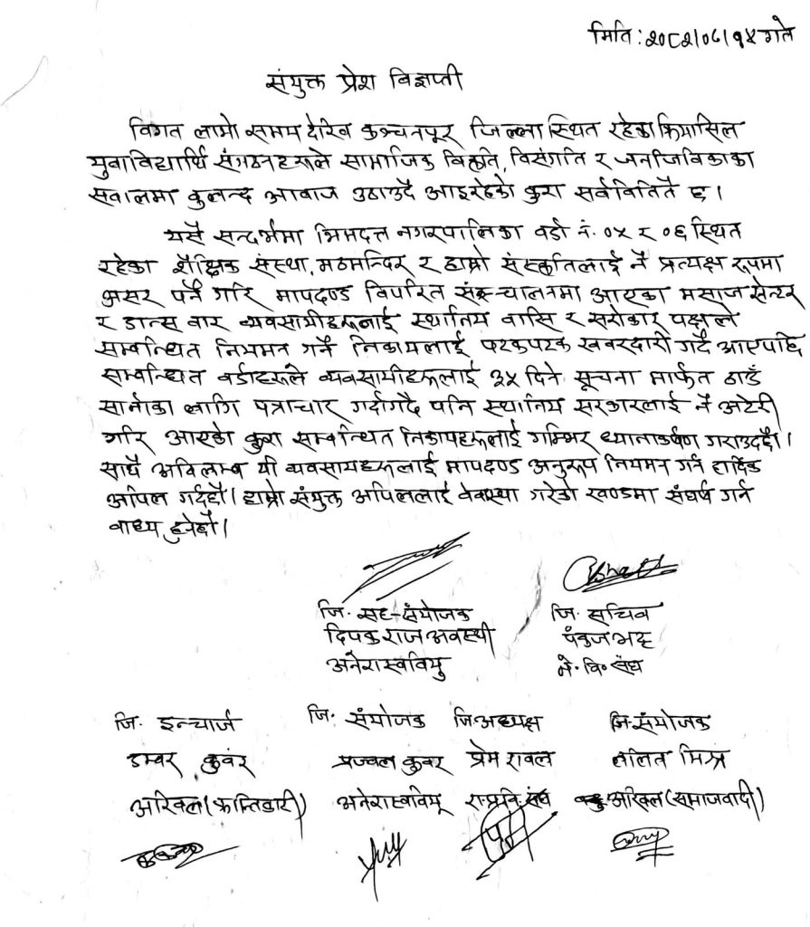 ६ विद्यार्थी संगठनले संयुक्त विज्ञप्ति जारी गर्दै ती क्षेत्रका मसाज सेन्टर र डान्स बार कानूनी मापदण्डअनुसार सञ्चालन नभएको उल्लेख गर्दै तत्काल नियमनको माग गरेका छन्।