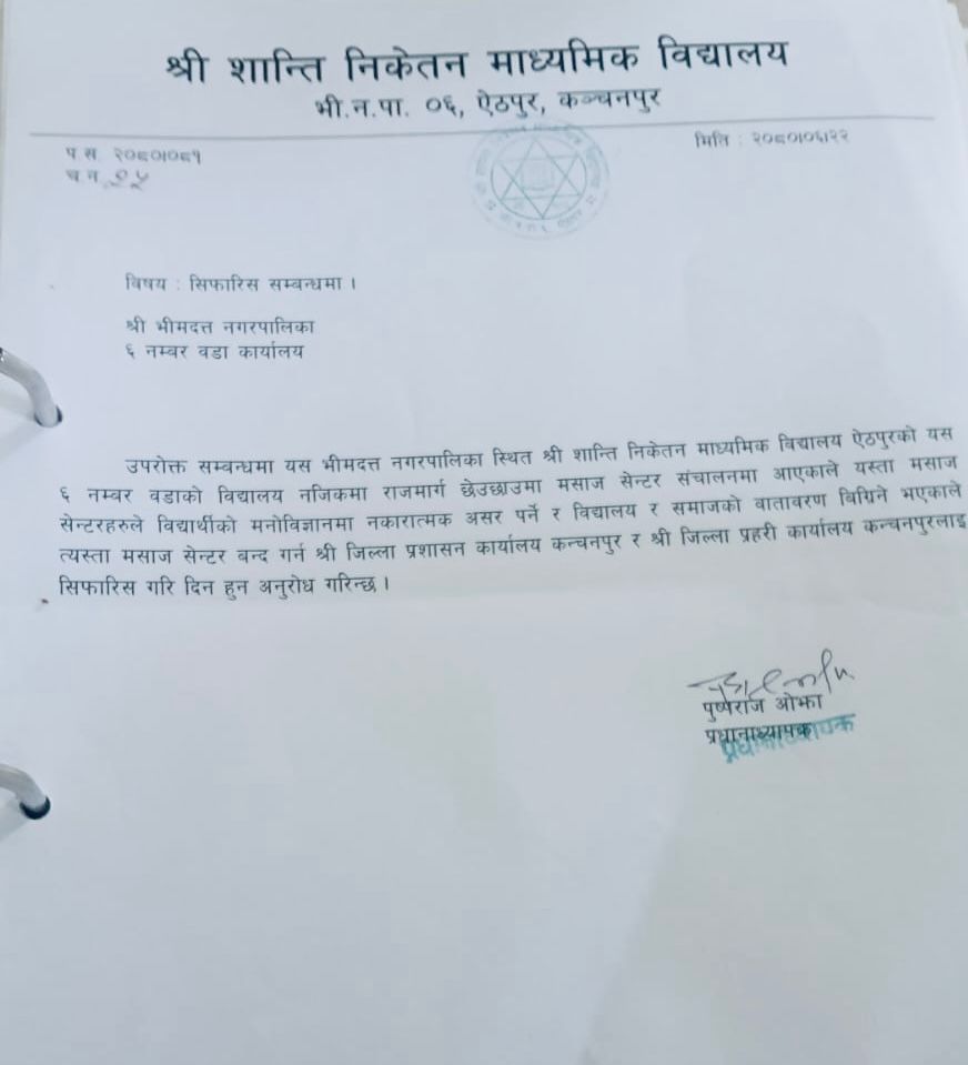 यसैबीच, भीमदत्त नगरपालिका–६ ऐठपुरस्थित श्री शान्ति निकेतन माध्यमिक विद्यालय ले पनि मसाज सेन्टरका कारण विद्यार्थीको मानसिकता र विद्यालय वातावरणमा नकारात्मक प्रभाव परेको भन्दै ती व्यवसाय बन्द गर्न सिफारिस गरेको थियो।